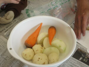 料理したのはカレーライスです。食材は春に種をまいたジャガイモやニンジンたちです。