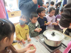 青年部の皆さんは17名来園し,園児らと一緒に料理を作りました。