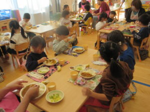 こどもたちにカレーライスの感想を聞くと「美味しかった」の感想が続々,料理体験をした年長さんは